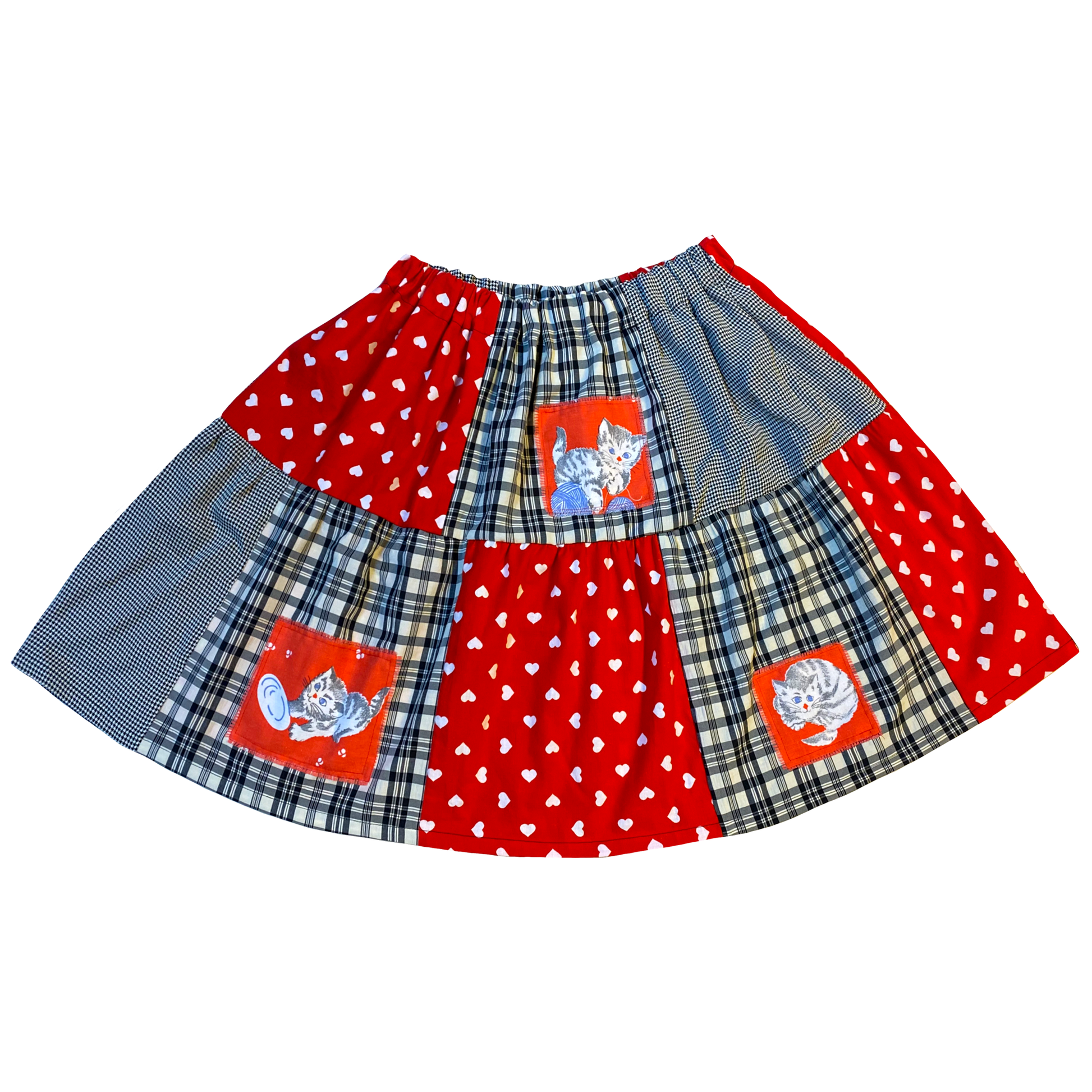 Ruutua, sydämiä ja kissatilkkuja! Puuvillakankaat vintagea ja tekstiiliteollisuuden ylijäämää. Ommeltu Tampereen Tammelassa ★ ˎˊ˗