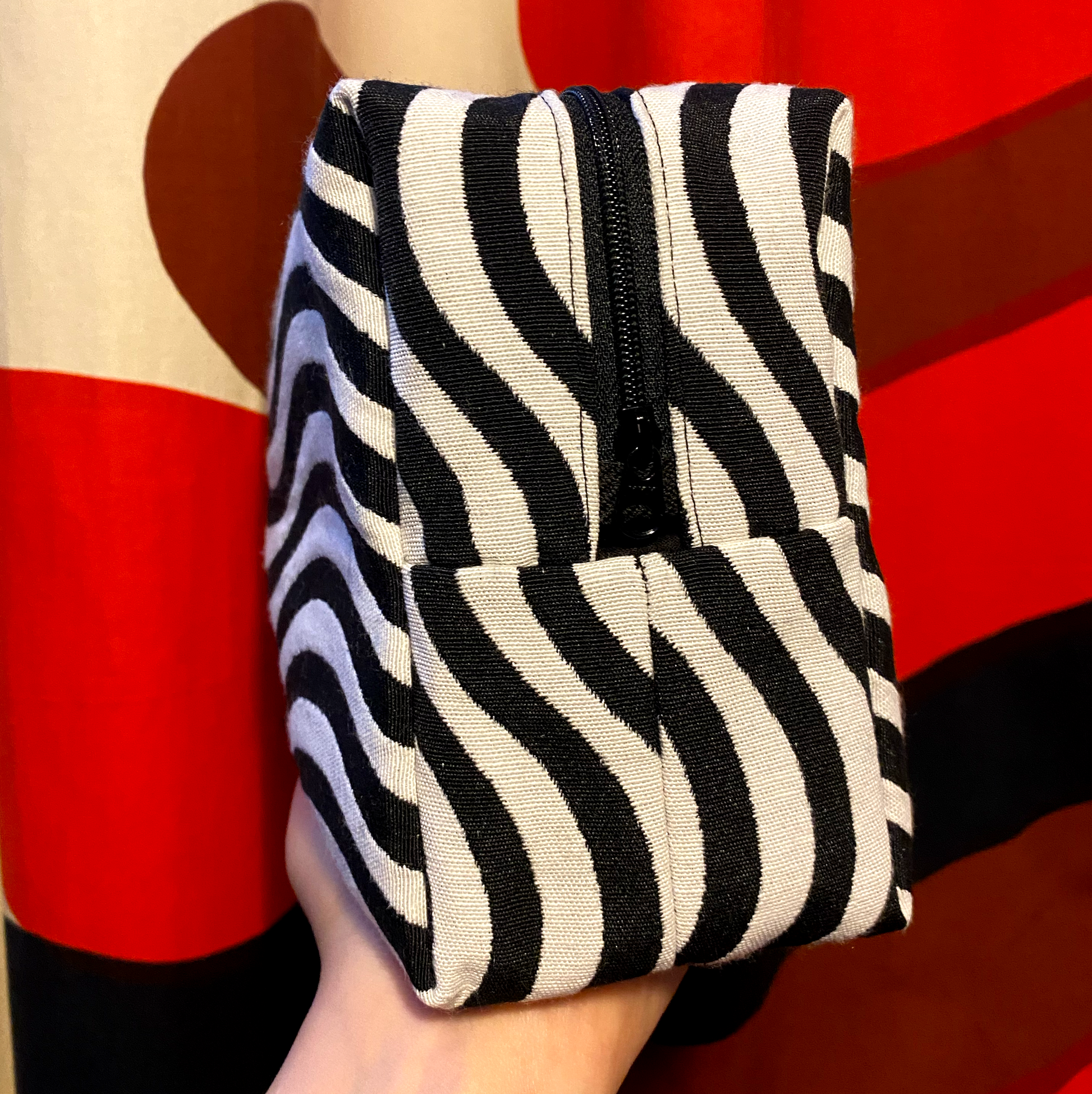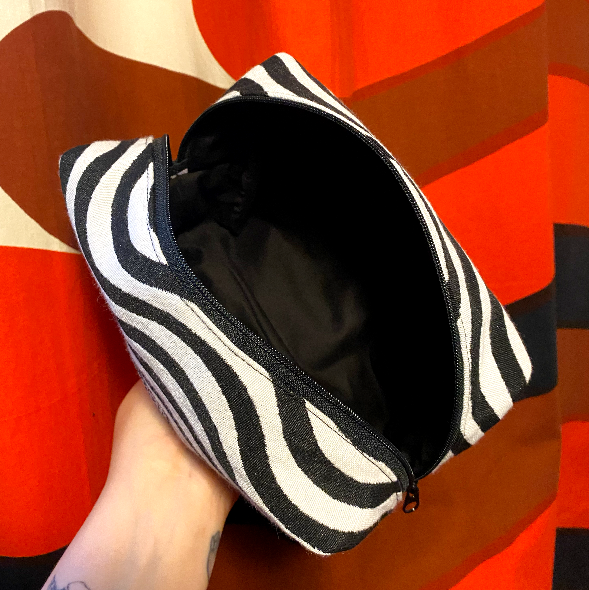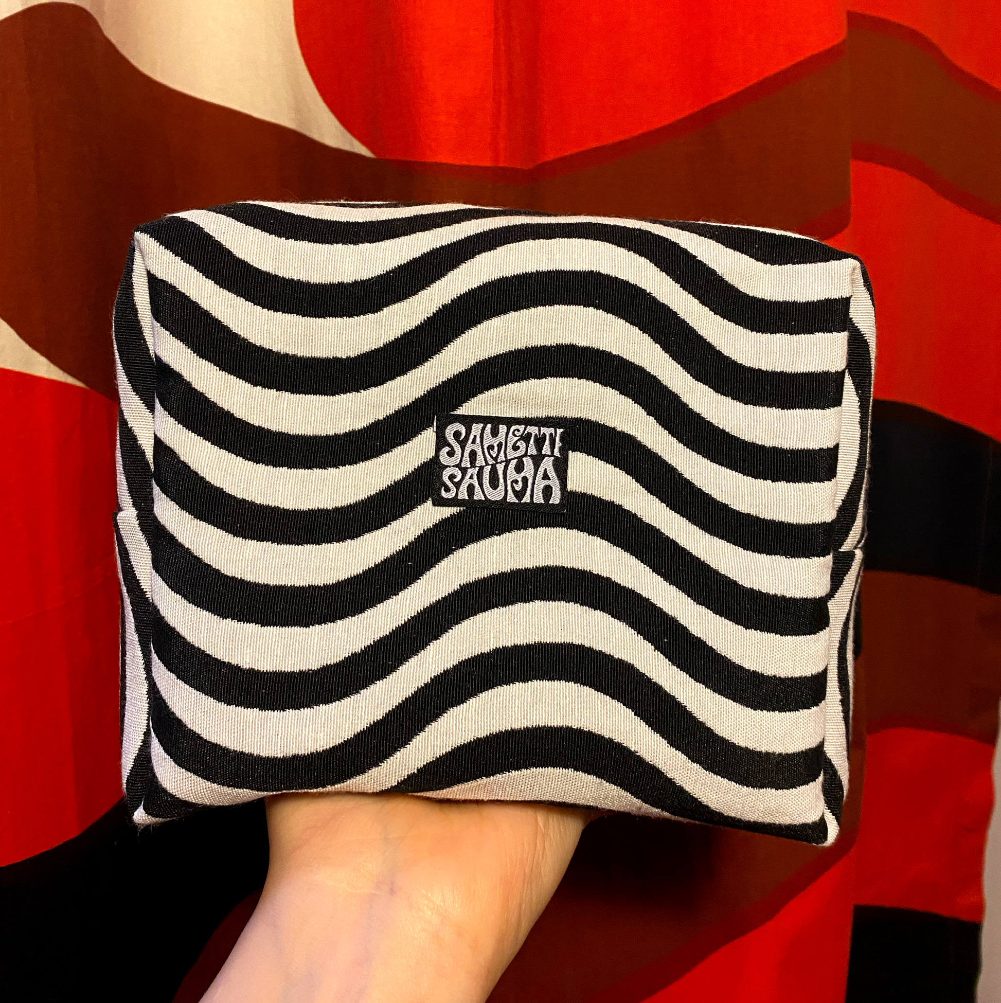 Laatikkomainen tilava pussukka vaikkapa meikeille. Koko noin 18 cm x 9 cm, korkeus 16 cm. Musta kierrätetty puuvillavuori.