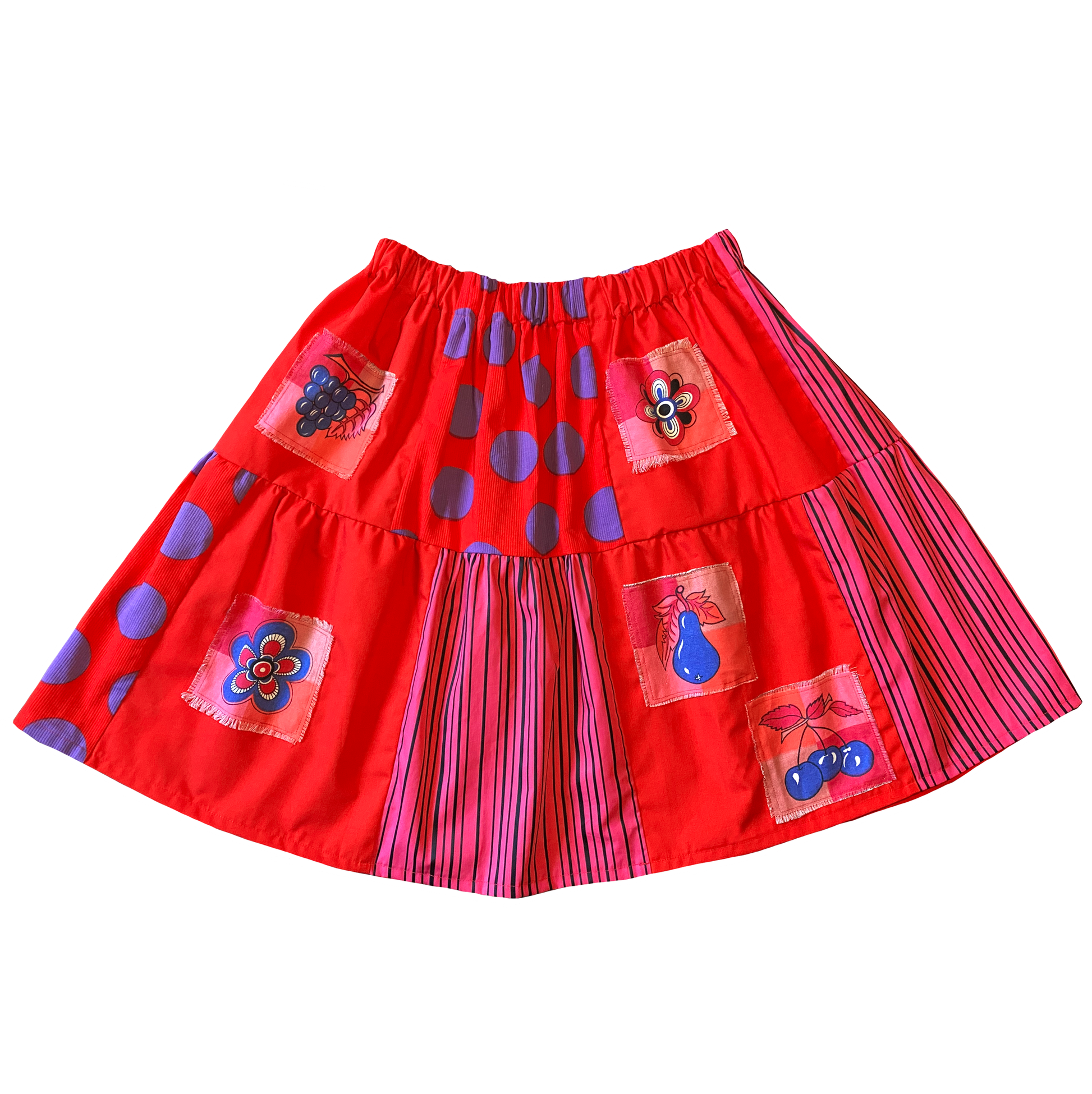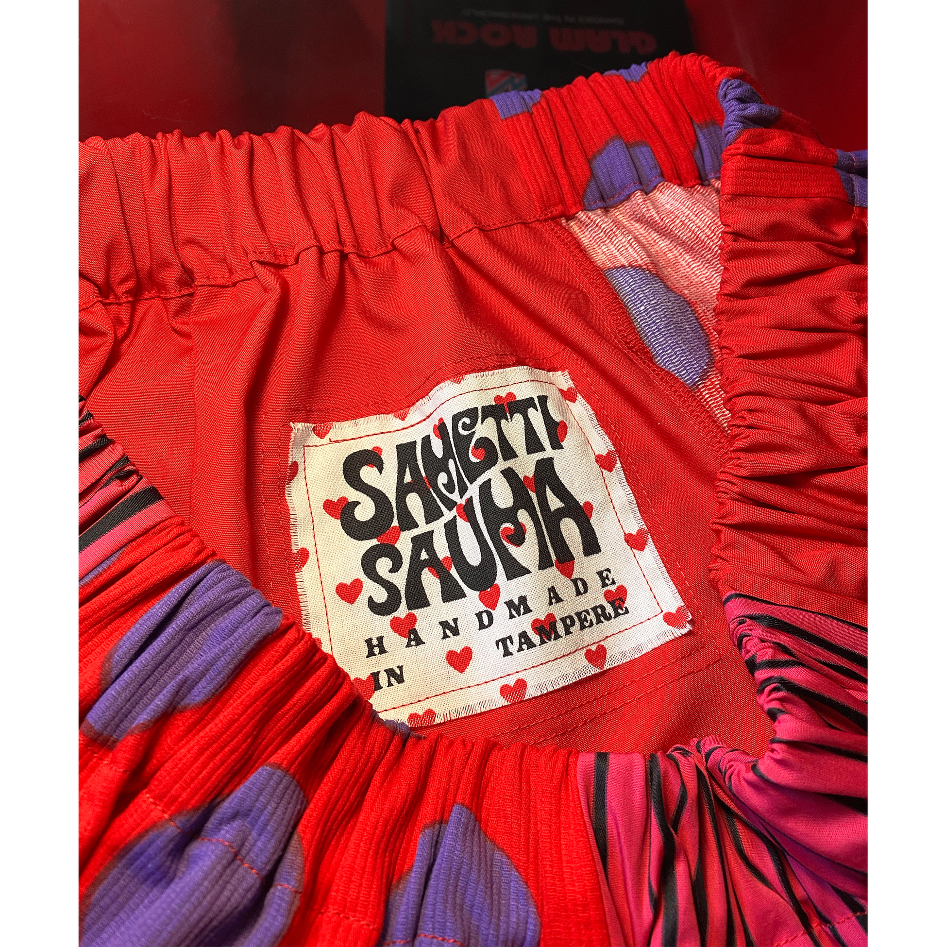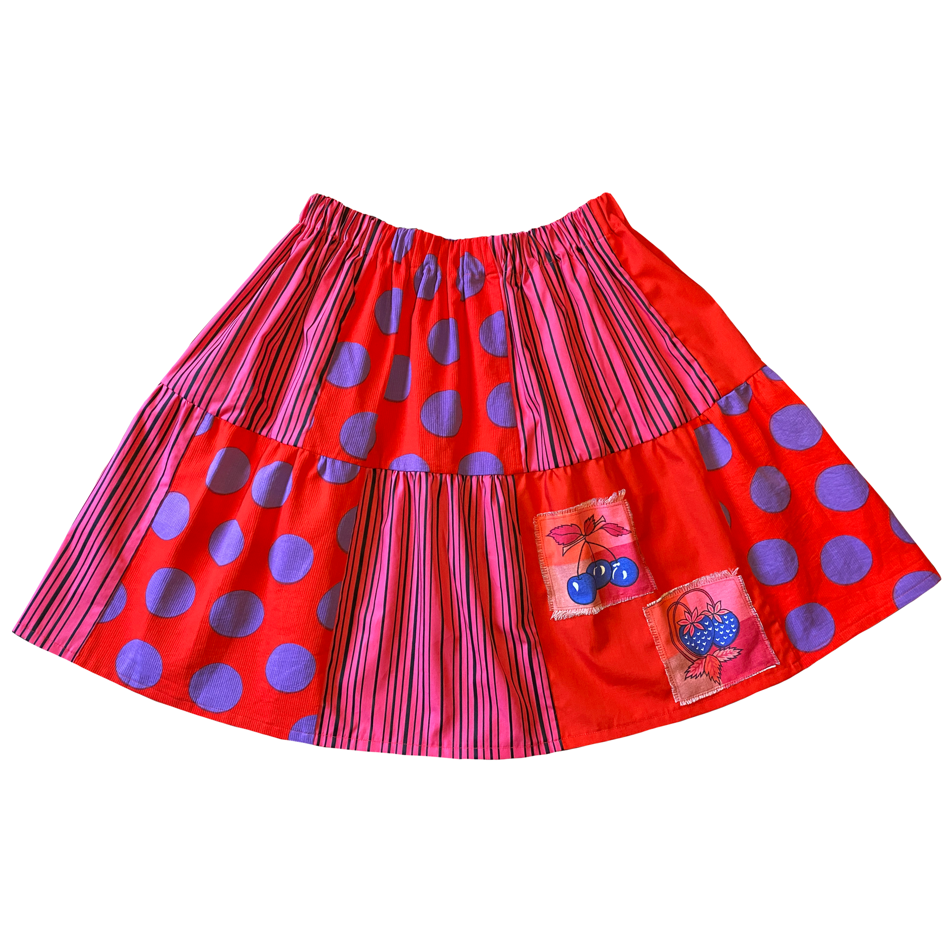 Punaista, pinkkiä ja violettia pallokuosia, puuvilla- ja puuvillasekoitekankaat vintagea ja tekstiiliteollisuuden ylijäämää. Ommeltu Tampereen Tammelassa ★ ˎˊ˗