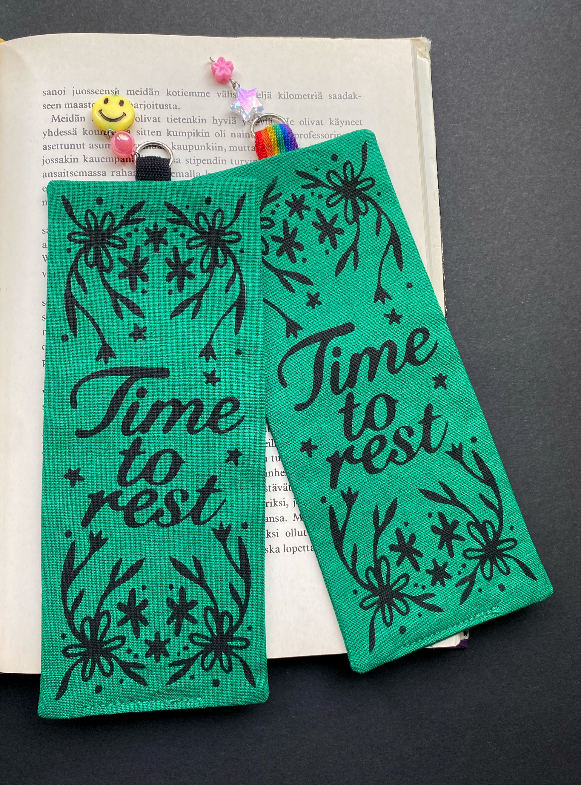Käsinpainettu kirjanmerkki kukkaiskuvituksella muistuttaa levon tärkeydestä ✦